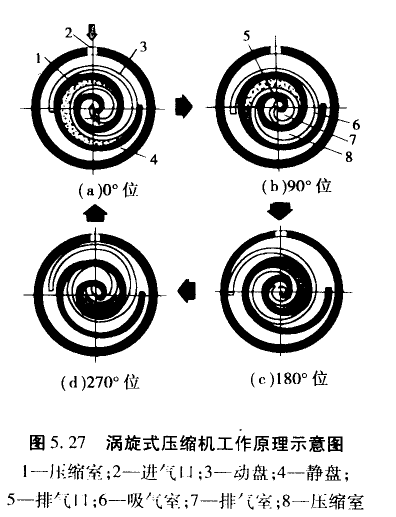 涡旋式压缩机的各个工作过程如图5. 27所示。当动盘位置处于0°,涡线体的啮合线在左右两侧,由啮合线组成封闭空间,此时完成了吸气过程;当动盘顺时针方向公转90°时,密封啮合线也移动90°,处于上、下位置,封闭空间的气体被压缩。与此同时,涡线体的外侧进行吸气过程,内侧进行排气过程;动盘公转180°时,涡线体的外、中、内侧分别继续进行吸气、压缩和排气过程;动盘继续公转至270°时,内侧排气过程结束,中间部分的气体压缩过程也告结束,外侧吸气过程仍在继续进行;当动盘又转至图5.27a所示位置时,外侧吸气过程结束,内侧排气过程仍在进行,如此反复循环。