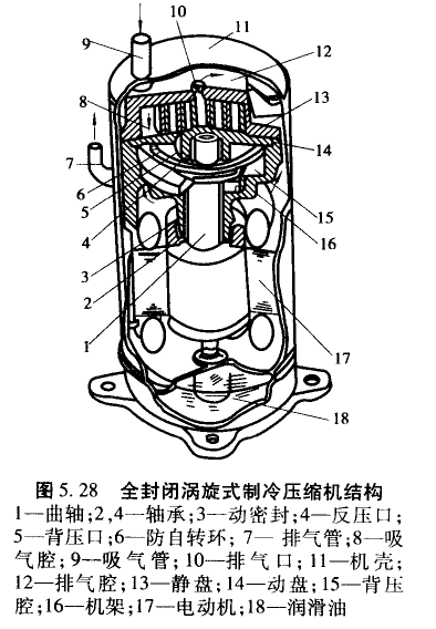 如图5.28所示,压缩机布置在上方,电动机置于下方,来自蒸发器的制冷剂蒸气由机壳上部的吸气管吸入到涡线的外周,压缩后由静盘上方的排气口排至排气腔,然后导入下部电动机室,冷却电动机后由排气管排出。曲轴由机体上的轴承支承,动盘由中间压力支承,将它压在静盘上。利用排气压力与中间压力之间的压力差,润滑油通过曲轴中心的油孔供至各轴承处,然后排向中间压力室,再由中间压力室的小孔导入压缩机腔,随蒸气一起排出,在机壳内经过二次分离,积存于机壳底部,供再循环使用。为了防止压缩机停机时高压气体的倒流,引起压缩机动盘的倒转,在吸气管端部装有内藏式止回阀。