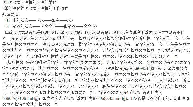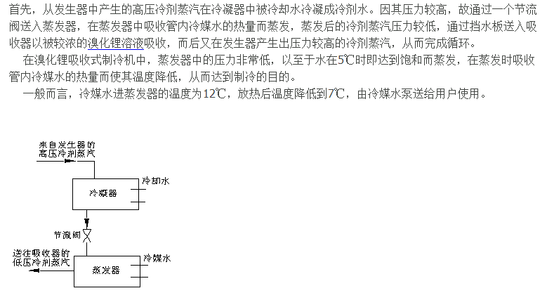 溴化锂吸收式制冷机中的制冷剂就是水。水在制冷循环中状态不断改变,并利用其在蒸发时的吸热而产生制冷的。