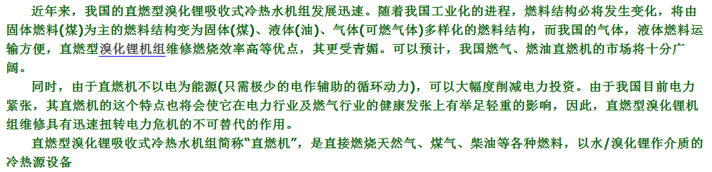 早在本世纪三十年代初就已经有直燃型溴化锂吸收式制冷机组,到1968年在日本才开发出大型的以燃气作为热源的直燃型溴化锂吸收式冷热水机组。这种机组发展迅速,目前已经是市场上重要的制冷机组之一。