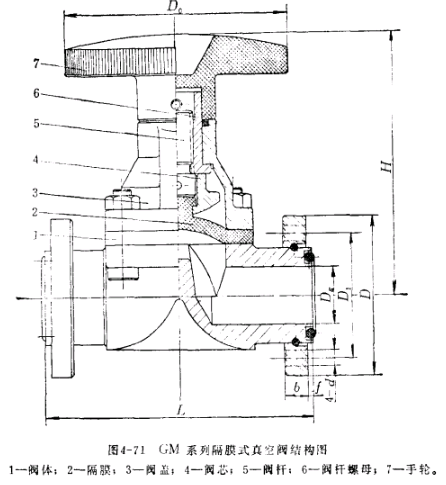 图4-71为GM系列隔膜式真空阀的结构图,表4-7为其主要规格性能。