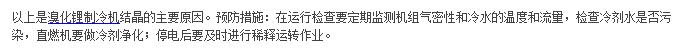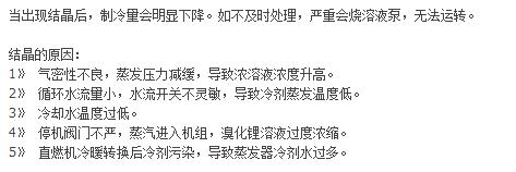 溴化锂吸收式制冷机是用溴化锂溶液作为吸收剂,起着吸收和制冷的作用,运行中如果出现浓度过高和温度过低现象,溴化锂会以晶体的形式从溴化锂溶液中分离出来,类似人患了血液粘粥导致动脉硬化。