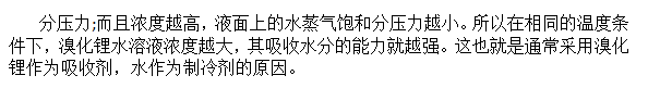 在溴化锂吸收式制冷中,由于溴化锂水溶液本身沸点很高,极难挥发,所以可认为溴化锂饱和溶液液面上的蒸汽为纯水蒸汽;在一定温度下,溴化锂水溶液液面上的水蒸气饱和分压力小于纯水的饱和。