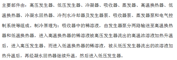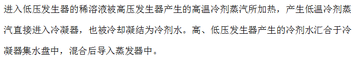 进入高压发生器的稀溶液被工作蒸汽加热,溶液沸腾,产生高温冷剂蒸汽,导入低压发生器,加热低压发生器中的稀溶液后,经节流进入冷凝器,被冷却凝结为冷剂水。