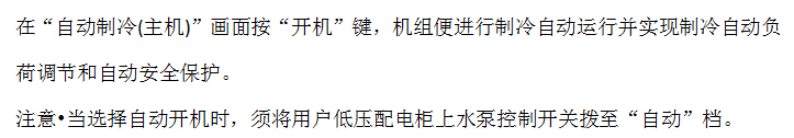 进入机组操作屏“控制方式选择”画面,选择“机组自动”,按“确认”键,进入“自动制冷(主机)”画面。