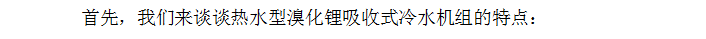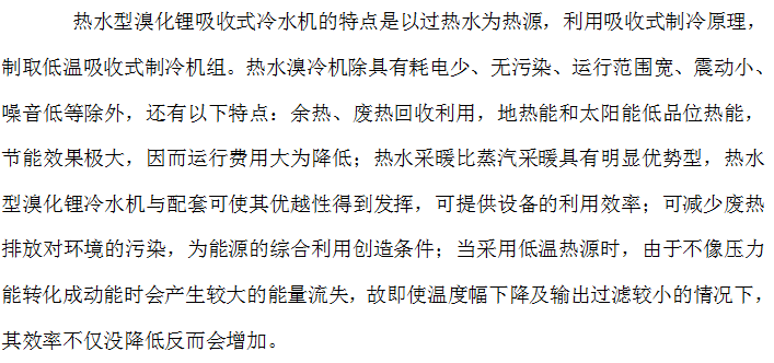 冷量调节简单方便,工况范围大,可利用20摄氏度河水或海水作为冷却水。热水型溴冷水机的蒸发器、冷凝器、吸收器在结构上与蒸汽型溴冷水机相同。但低温热水型、双极热水型的发生器一般采用喷淋式。