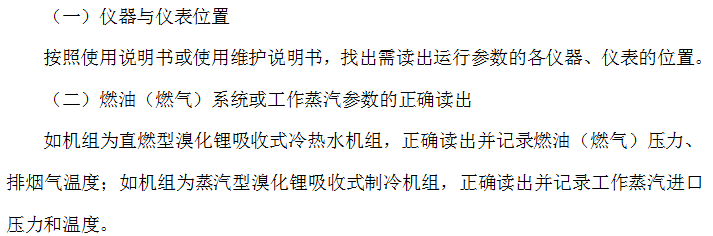 正确读出并记录高压发生器压力、浓溶液出口温度、液位,低压发生器压力、浓溶液出口温度、液位,吸收器冷却水进口温度、冷却水出口温度、稀溶液出口温度、冷凝压力和冷凝器冷却水出口温度、蒸发温度、蒸发器液位、冷(温)水进水温度、冷(温)水出水温度。