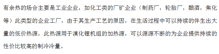 溴化锂吸收式冷水机组主要以余热回收为主,即有余热的地方都可以用(余热包括:蒸汽、热水、烟气等)。