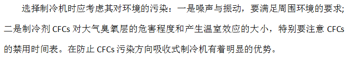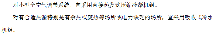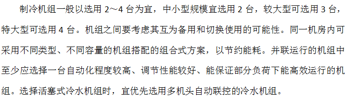 选择电力驱动的冷水机组时,当单机空调制冷量φ>1163kW时,宜选用离心式;φ=582~1163kW时,宜选用离心式或螺杆式;φ<582kW时,宜选用活塞式。
