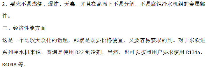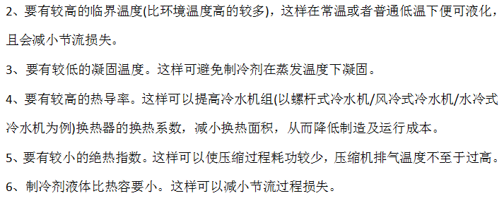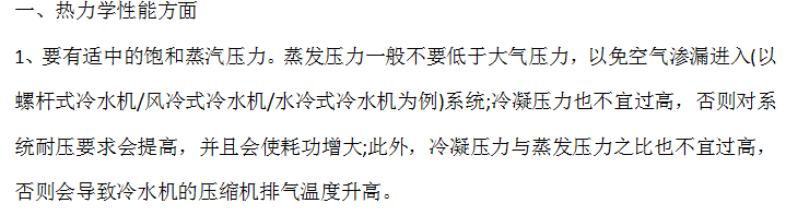 1、要有较小的密度和黏度,这样可以减小制冷剂在机组制冷系统(以螺杆式冷水机/风冷式冷水机/水冷式冷水机为例)中的流动阻力损失。