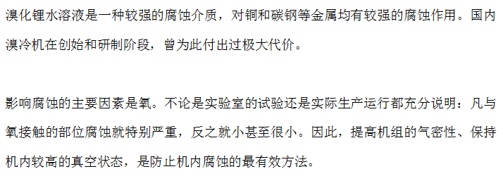 溴化锂吸收式制冷机的腐蚀范围包括机内腐蚀和水侧腐蚀。