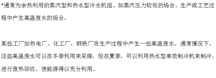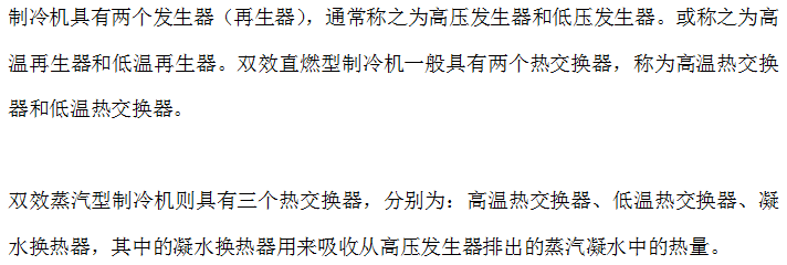 *驱动热源在机组的高压发生器被直接利用,并在低压发生器内被间接地第二次利用。通常为蒸汽压力较高的蒸汽型机组以及直燃型冷温水机组。