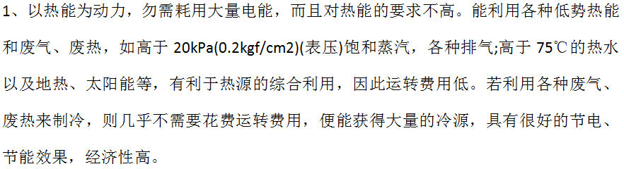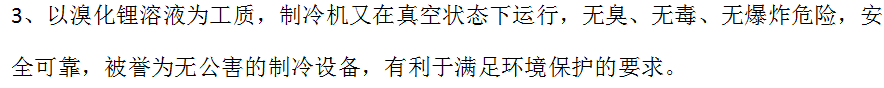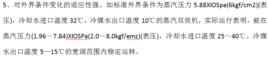 4、冷量调节范围宽。随着外界负荷变化,机组可在10%~100%的范围内进行冷量无级调节,且低负荷调节时,热效率几乎不下降,性能稳定,能很好地适应变负荷的要求。