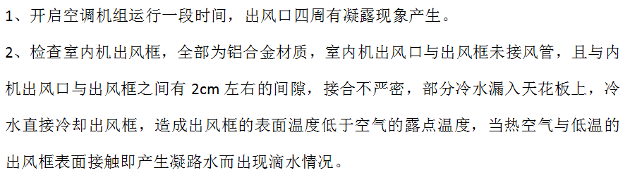 原因预判:室内机的水管路工程不畅通,接水盘有异物堵塞排水口或腐蚀穿孔漏水;出风框(铝合金)与风管接合不严重造成冷热对流产生冷凝水而漏水;