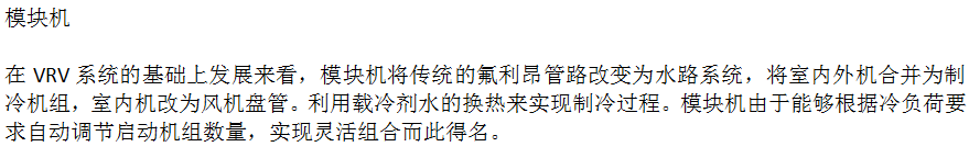 VRV系统是即制冷剂流量可变式系统。其形式为一组室外机,由功能机和恒速机,变频机组成。通过并联室外机系统,将制冷管道集中进入一个管道系统,可以方便根据室内机的容量匹配。室内机最多一组室外机可连接30台室内机,室内单机最小容量为0.6KW,最大为3.75KW,室内机的容量可在室外机容量的50%至130%内调节。