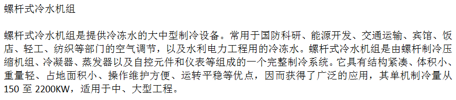 溴化锂吸收式冷水机组以热能为动力,以水为制冷剂,以溴化锂溶液为吸收剂,制取0℃以上的冷媒水,可用作空调或生产工艺过程的冷源,溴化锂吸收式以热能为动力,常见的有直燃型、蒸汽型、热水型三类,其冷量范围为230至5800KW,适用于中型、大型、特大型工程。