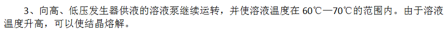 机组在运行中结晶,常发生在溶液热交换器浓液侧。如果结晶不严重,通过浓溶液经自熔晶管旁通到吸收器里,即可自行解除结晶,如果结晶严重,可按下列方法进行熔晶。