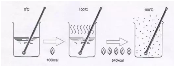 把100g水从0℃加热到100℃需要100Kcar热量(显热),把100g100℃的水蒸发成100℃蒸汽需要540Kcar的热量(汽化潜热)。