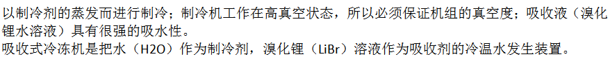 吸收式制冷机以水作为制冷剂,溴化锂作为吸收剂的一种水制冷机组。