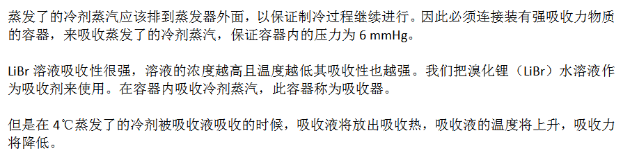 因此用冷却水进行冷却防止吸收力降低。此吸收热与制冷剂的蒸发潜热相当,既冷水的热量通过制冷剂的蒸发传到冷剂蒸汽中,冷剂蒸汽被吸收到吸收器中,其放出的热量又被冷却后传到冷却水中。