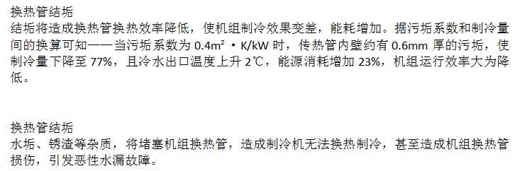 定期对机组水系统换热管进行维护保养,可有效增加其热交换率,降低能源消耗,延长设备使用寿命。