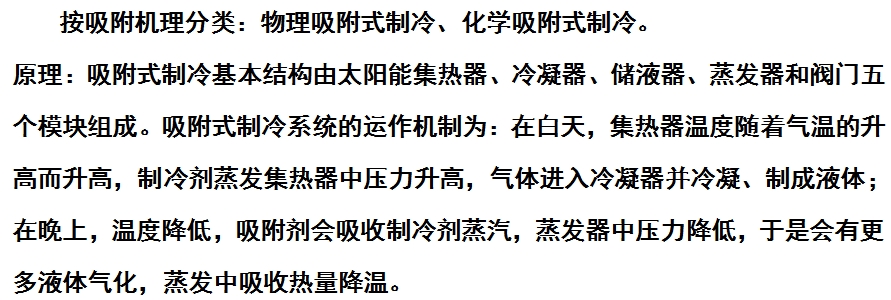 原理:一定的固体吸附剂对某种制冷剂气体具有吸附作用,且吸附能力随吸附剂温度的改变而不同。通过周期性地冷却和加热吸附剂,使之交替吸附和解吸。解吸时,释放出制冷剂气体,并使之冷凝为液体;吸附时,制冷剂液体蒸发,产生制冷作用。