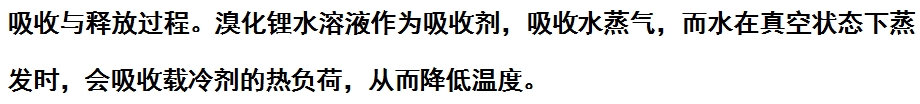 溶液的浓缩与稀释。在吸收过程中,溴化锂水溶液吸收水蒸气后,浓度增加,成为浓溶液;而在蒸发过程中,溶液中的水分被释放,浓度降低,成为稀溶液。