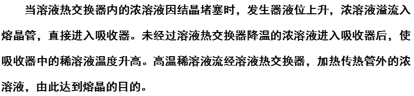 熔晶管:安装在发生器与吸收器之间,是溶液热交换器结晶后浓溶液流回吸收器的通道。