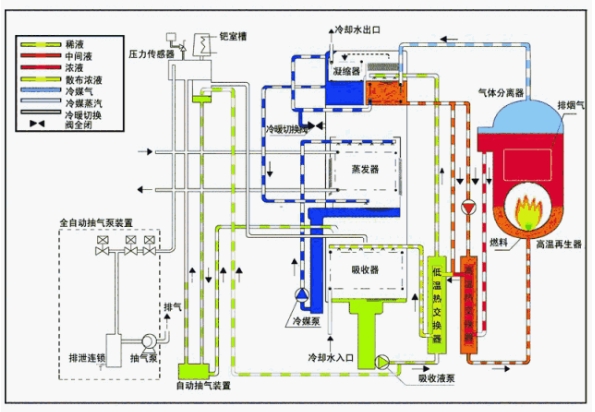 溴化锂制冷机是利用不同温度下溴化锂水溶液对水蒸汽的吸收与释放来实现制冷的,这种循环要利用外来热源实现制冷,常用热源为蒸汽、热水、燃气、燃油等。