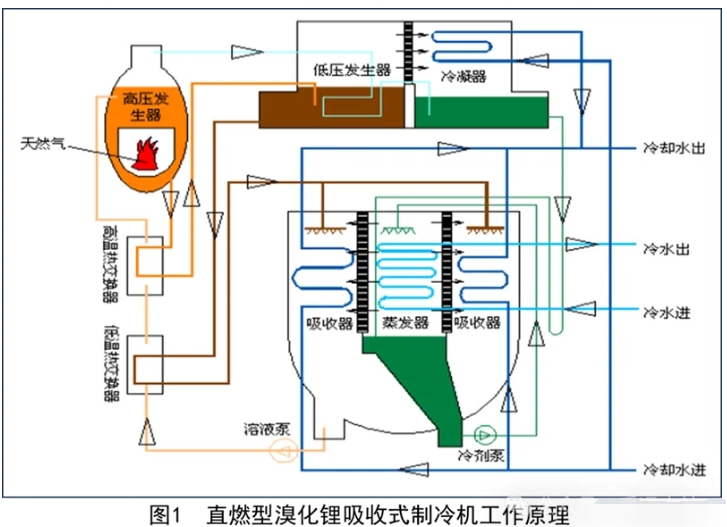 工作原理:图1所示为直燃型溴化锂吸收式制冷机组的结构