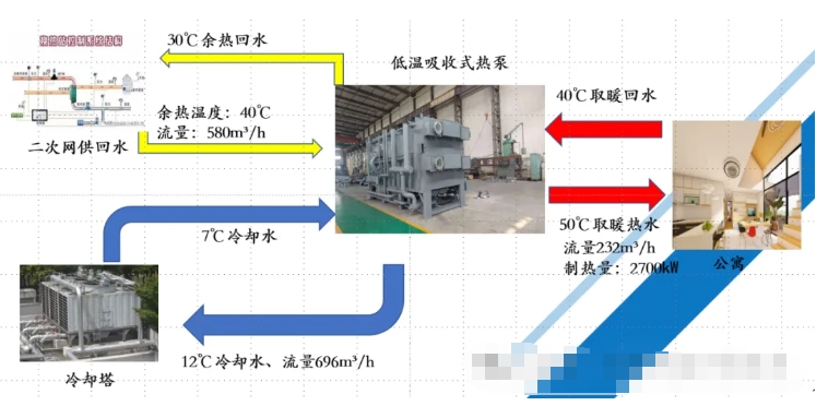 动力主要来源于工业废余热及一次供暖回水管网(50℃以