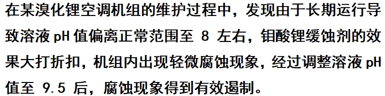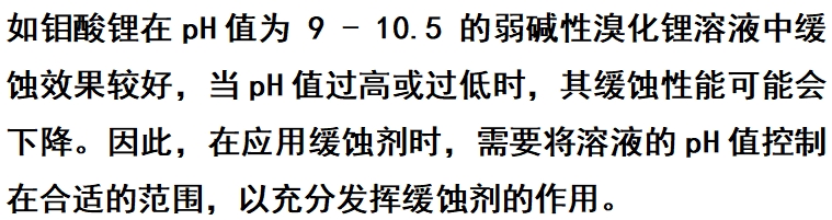 1. 与溶液酸碱度的关系:溴化锂溶液的pH值对缓蚀剂的效