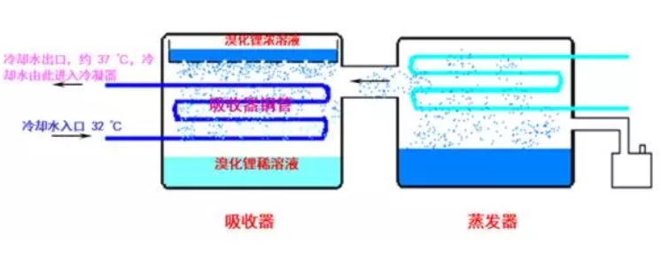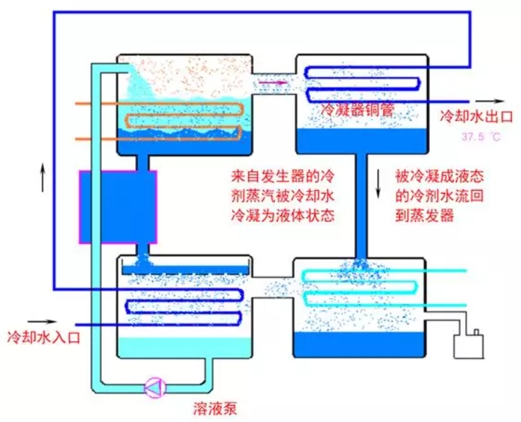 铜管内的冷却水降温,使来自发生器内的水蒸汽冷凝为液