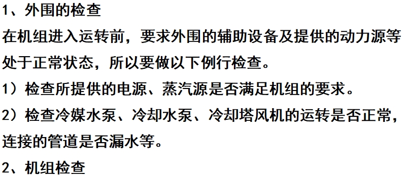 在制冷机组启动运转前,要求对制冷机组脱离辅助设备的状况进行一番检查,方能启动制冷机组运转。