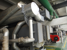 双效溴化锂制冷机,一般形式为三筒式。主要部件由:高压发生器、低压发生器、冷凝器、吸收器、蒸发器、高温换热器、低温换热器、冷凝水回热器、冷剂水冷却器及发生器泵、吸收器泵、蒸发器泵和电气控制系统等组成。制冷原理为:吸收器中的稀溶液,由发生器泵分两路输送至高温换热器和低温换热器,进入高温换热器的稀溶液被高压发生器流出的高温浓溶液加热升温后,进入高压发生器。而进入低温换热器的稀溶液,被从低压发生器流出的浓溶液加热升温后,再经凝水回热器继续升温,然后进入低压发生器。