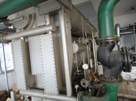 目前,我国除少数大冷量和特殊用途的冷冻机外,一般用途的活塞式、离心式、螺杆式、溴化锂吸收式、蒸汽喷射式制冷机,以及冷冻、冷藏、低温试验等设备都能自己制造。各种类型制冷机主要特点如下: (1)螺杆式制冷机:结构简单、易损件少、使用寿命长、单级压缩比高,在大中型制冷量范围内有取代活塞式的趋势。(2)活塞式制冷机:技术发展比较成熟,效率高,使用温度范围广,可制成大中小型各种规格产品,是各种制冷机中应用广的机种 回收溴化锂机组中溶液热交换器的作用在于回收热量,减少热损失。我们知道,从发生器出来的浓溶液温度较高,为了吸收冷剂蒸汽,必须把它的温度降低(由冷却水带走热量)。另一方面,由吸收器出来的稀溶液温度较低,把它送往发生器产生冷剂蒸汽,又需要外界热源来加热。因此,把浓溶液和稀溶液在溶液热交换器中进行热交换,不仅可以减少吸收器中冷却水带走的热量,而且可以减少外界加入发生器的热量,使溴化锂机组的热效率提高。 鉴于机组是在高真空下工作,为了抽除不凝性气体,机组中还必须设有抽气装置。这种抽气装置可以是机械真空泵,也可以是其它型式的自动抽气装置。