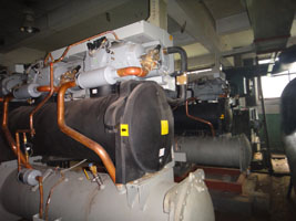 半封闭式机组:电动机与压缩机做为一体,中间用法兰联接,能有效防止制冷剂和润滑油的泄漏,并采用制冷剂冷却电动机,消除了开启式机组中电动机冷却风扇的噪声。