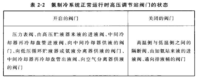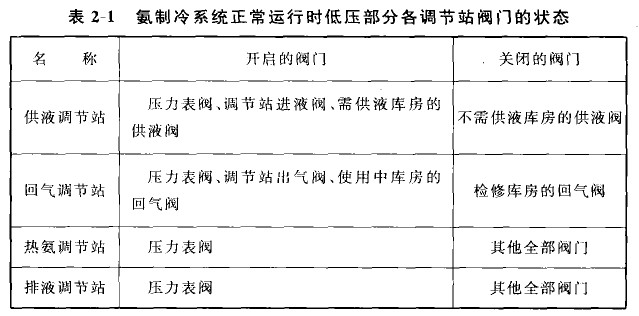 正常运行时,氨制冷系统中低压部分各调节站阀门的状态见表2-1,高压调节站阀门的状态见表2—2,各主要设备上阀门的状态见表2—3。