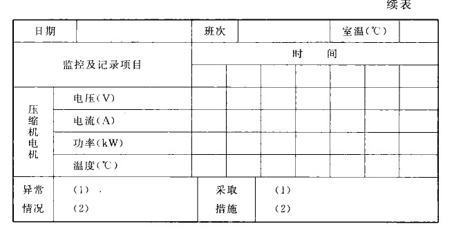 活塞式制冷压缩机正常运行每两小时应记录一次运行参数,操作记录的推荐格式见表2-4。