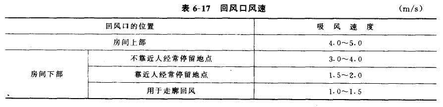 回风口的大小根据回风量与回风口的风速确定,一般回风口风速可按表6-17确定。
