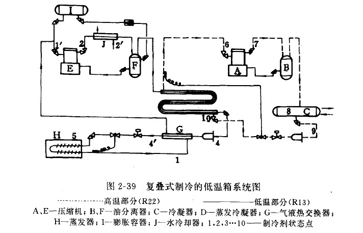 图2-39是采用复叠式制冷的低温箱系统图,分别由两台单级压缩机构成高温和低温制冷循环,高温部分采用R22制冷剂,低温部分采用R13制冷剂。在高温循环中,进入蒸发--冷凝器的R22液体,吸收了低温循环中压缩机排出的R13蒸气的热量而汽化,汽化后被压缩机吸入并压缩,再排入油分离器分离润滑油,再进入水冷式冷凝器冷凝成R22液体。从冷凝器出来的R22液体,经过干燥过滤器、热交换器、电磁阀、热力膨胀阀后重新进入蒸发一冷凝器汽化,如此不断循环。在低温循环中,R13液体在低温蒸发器内吸收了被冷却对象的热量后汽化,汽化后的R13被压缩机吸入并压缩,然后进油分离器,分离后的R13蒸气进入蒸发一冷凝器,放热后冷凝成R13液体,出来后再经过过滤器、换热器、电磁阀、热力膨胀阀重新进入蒸发器汽化制冷,然后继续循环。