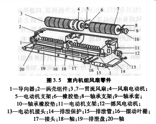 贯流风扇及电动机完成室内空气的循环。与窗式空调器离心风扇相比,贯流风扇叶片数目多,转速低,因而在保持总送风量不变的情况下,噪声有明显降低。