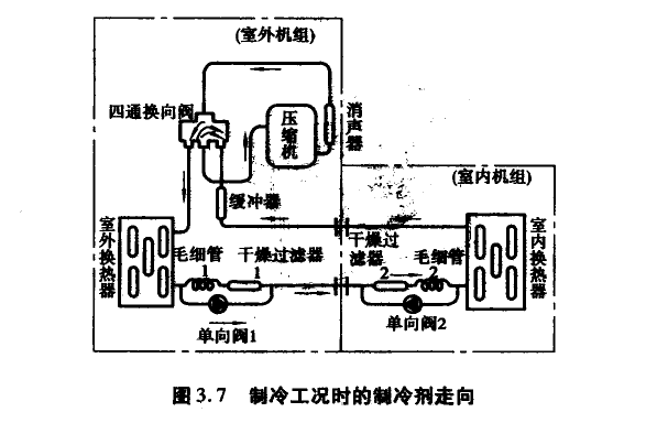 制冷状态下制冷剂流向为:压缩机→消声器→四通换向阀→室外换热器(此时为冷凝器)→单向阀→干燥过滤器2→毛细管→室内换热器(此时为蒸发器)→缓冲器→四通换向阀→压缩机。