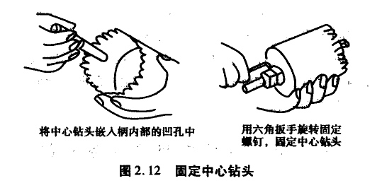 3)把中心钻头嵌入柄内部的凹孔中,用六角扳手紧固固定螺钉,使中心钻头固定好,如图2. 12所示。