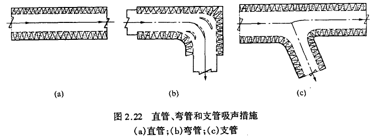 由于高速空气调节系统的采用,使得空调、通风系统噪声提高。如采用高压通风机后,系统噪声往往达到80-90 dB(A)。为实现对送风系统的噪声控制,较多采用的预绝缘风管是在末端风管或风管弯头处内表面预先敷设吸声(兼隔热)材料。图2.22所示即为内表面敷设了吸声材料的预绝缘管,它起到了吸声、隔热和防潮的作用。吸声材料多为超细玻璃棉或聚氨酯泡沫塑料。为了避免松散吸声材料(如玻璃棉等)被高速气流冲掉,在其表面涂了一薄层氯丁橡胶或者用穿孔薄钢板或钢丝网内衬玻璃纤维布作护面层。