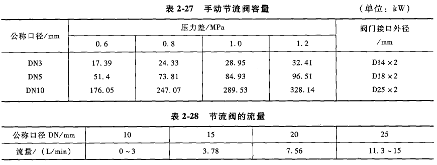 (1)手动节流阀表2-27、表2-28是手动节流阀容量特性,选型时根据阀前后压力差、阀门所处制冷回路的制冷量(稍大于实际制冷量,下同)确定阀门的通径,选择与之相对应的节流阀型号。
