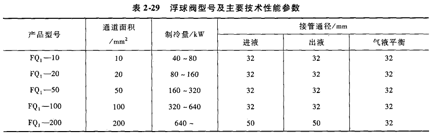 浮球阀一般根据制冷系统制冷量的大小来选用,表2-29所示为某国产浮球阀的型号与主要技术性能参数,供选型参考。