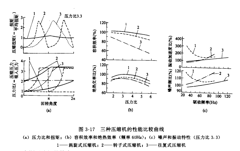 图3-17给出了往复活塞式、滚动转子式、涡旋式三种压缩机的性能比较曲线。图(a)绘出了三者之间的扭矩,可以看出,涡旋式力矩变化平稳,压缩室之间的压差也小。图(b)绘出了三者的容积效率和绝热效率,表明涡旋式、转子式其次、往复式差。图(c)绘出了噪声和振动特性。