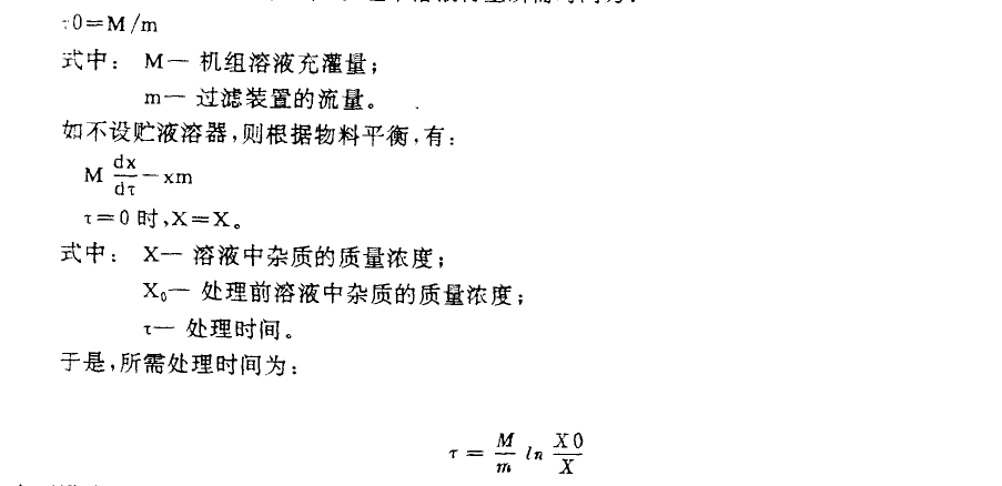 在不设贮液溶器的情况下,溶液的处理时间较之装有贮液溶器时要长的多。假定溶液中的杂质含量要降至处理前的万分之一,则从理论上说,无贮液溶器时所需时间为有贮液褡器时间9.21倍。