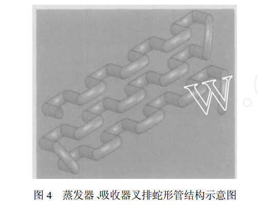 以前蒸发器和吸收器采用螺旋盘管形式 ,因为加工精度和安装精度的限制 ,不能保证下滴的液体完全留到盘管上 , 而且因为布液板距离盘管有 10cm 的距离 ,蒸发器 、 吸收器内的横向气流也会影响下滴液体在盘管上均匀的布液 ,使吸收器和蒸发器盘管得不到充分的利用 ,很多冷剂水没有蒸发就流到了蒸发器底部 ,使制冷量降低。 为解决上述问题 ,蒸发器结构采用叉排蛇形换热管形式。 为使其结构紧凑 ,采用正三角形排列。 由 Φ 8mm 紫铜管和 Φ 10mm 紫铜弯头焊接而成 ,共有 20 层 ,如图 4 所示 ( 蒸发器共有 20 层蛇形管 ,图中示意性地画出了 3 层) 。